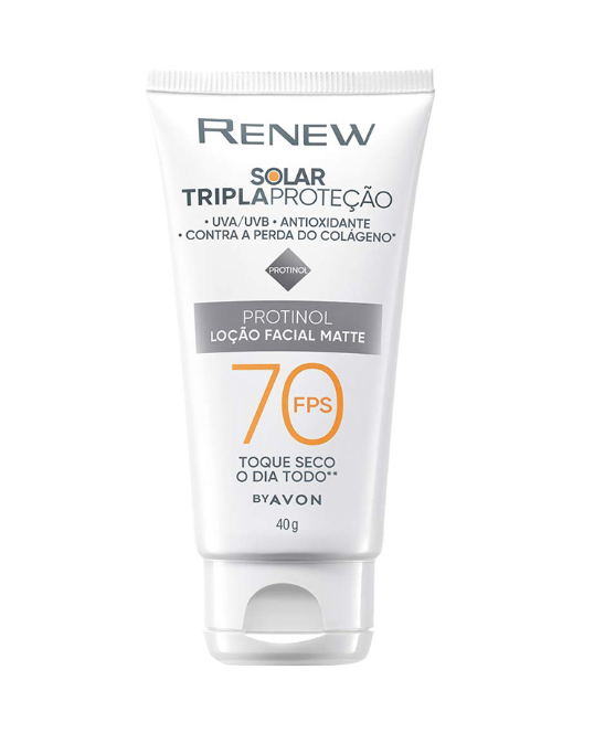 Renew Solar Tripla proteção, protege a sua pele dos raios UVA/UVB, antioxidante e contra a perda de colágeno*. Ajuda a proteger e minimizar os efeitos nocivos do sol agora e no futuro na pele. Proteção solar como você nunca viu: Tripla proteção com textura leve que previne o envelhecimento, preenche linhas finas através da hidratação e tem acabamento invisível para todos os tons de pele. Alta proteção Renew, agora com tecnologia Protinol, que potencializa a produção de dois tipos de colágeno, deixando a pele mais preenchida através da hidratação e firme. Protinol, ingrediente exclusivo e desenvolvido pela Avon, que potencializa a produção de dois tipos de colágeno, deixando a pele mais preenchida através da hidratação e firme Tripla proteção que não pesa na pele, tem acabamento matte e invisível, não deixa resíduos brancos em nenhum tom de pele. Acabamento invisível para todos os tipos de pele, até para as retintas - não deixa resíduos brancos ou acinzentados Minimiza os efeitos causados pela luz visível e pelos raios infravermelhos. Indicado para pele extremamente sensível a queimadura solar.